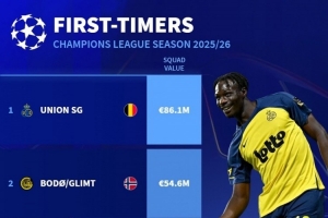 欧冠新军身价排名:圣吉罗斯8610万欧最高,凯拉特1280万欧垫底